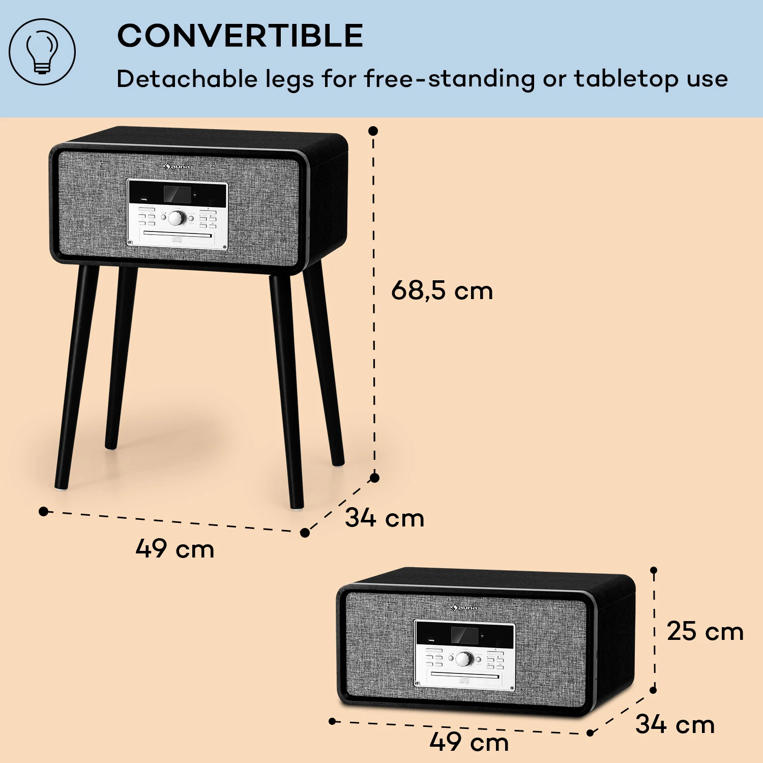 Gramofon auna Mary Ann je sodobna tehnologija v elegantni retro obleki iz 50. let prejšnjega stoletja. Zahvaljujoč odstranljivim nogam navdihuje kot variabilno oblikovno pohištvo v slogu stranske mizice ali kot namizna enota z videzom svetovnega sprejemnika!